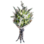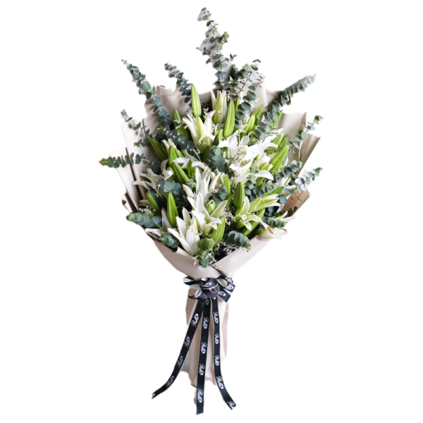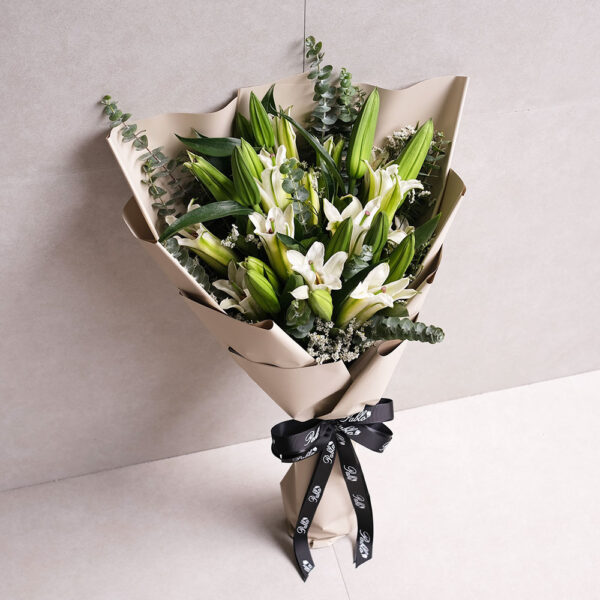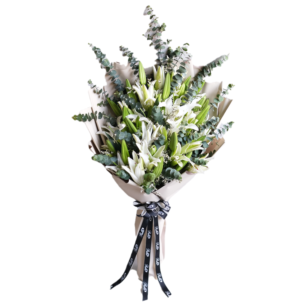 Make a lasting impression with this elegant bouquet of 5 lilies, accented with fresh eucalyptus leaves. Soft, graceful, and effortlessly captivating.
