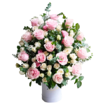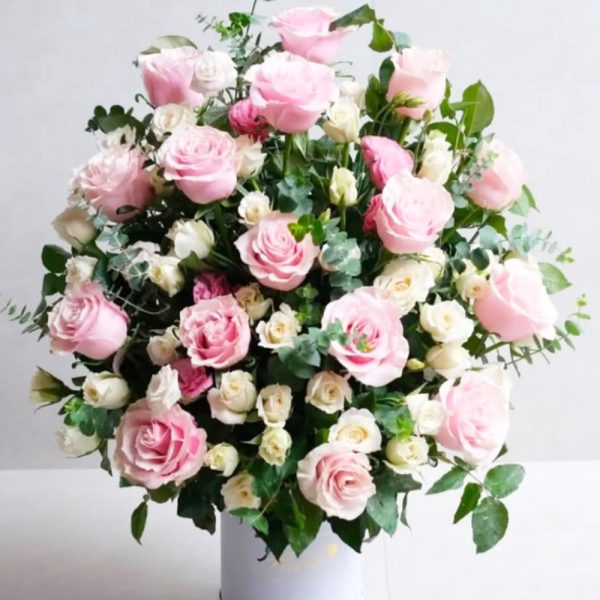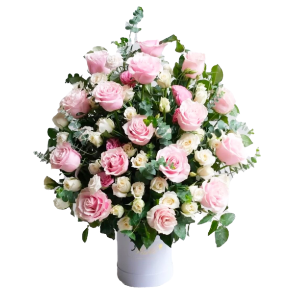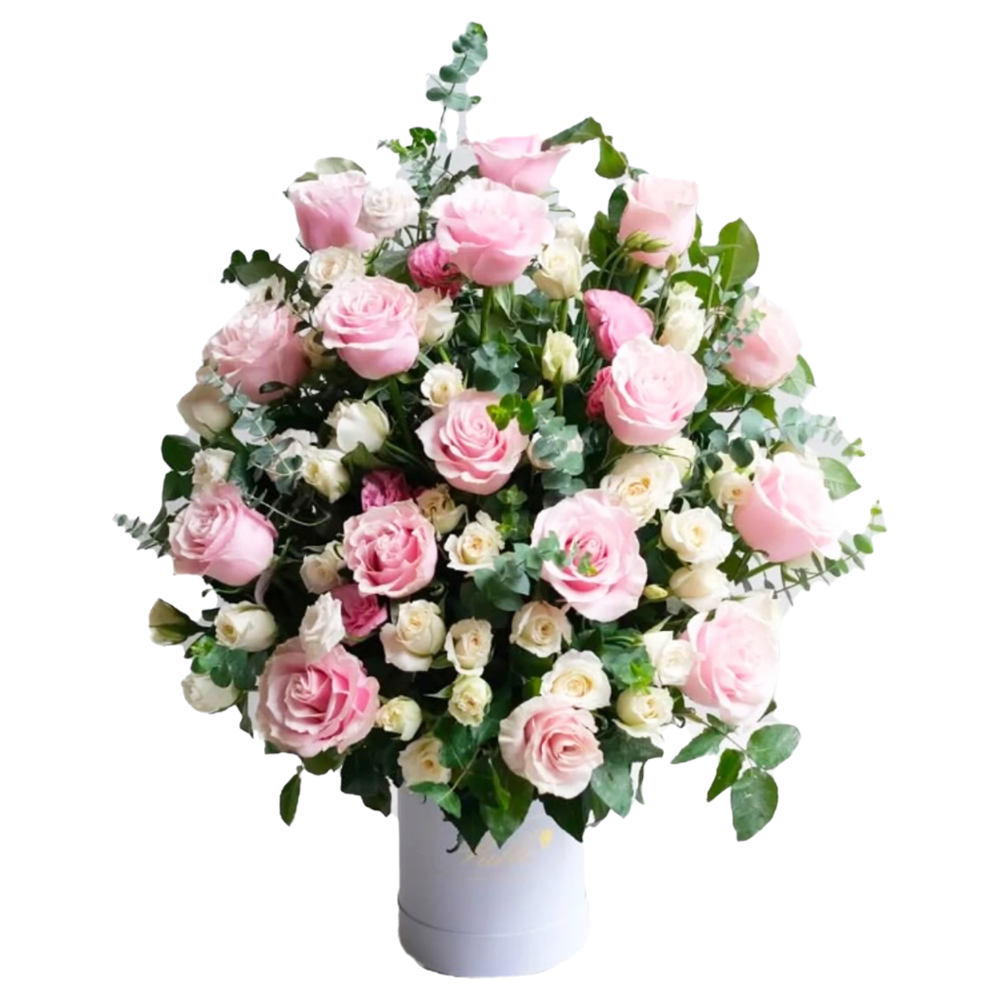Bold half-face design with 16 Ecuadorian roses, color of choice in local roses, and eucalyptus — clean, creative, and eye-catching.