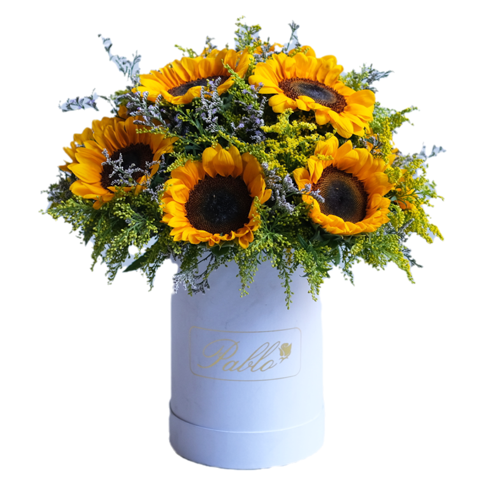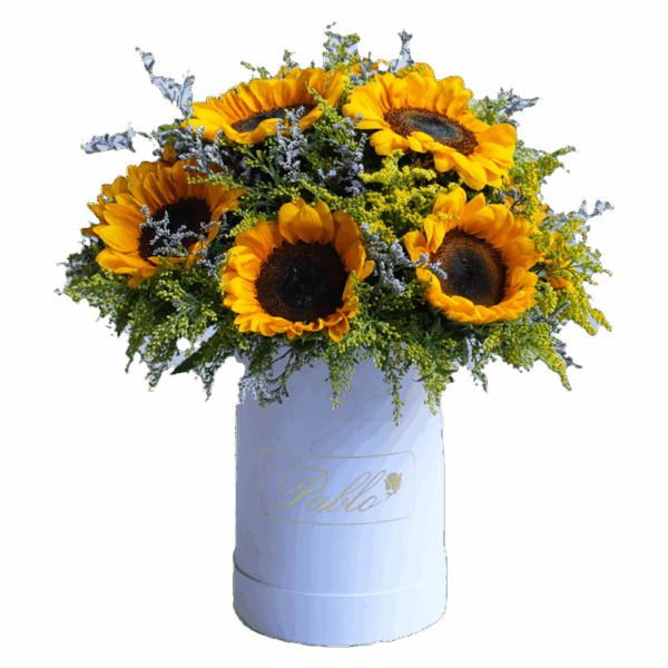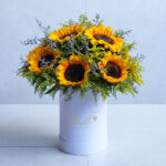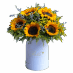 A delightful dozen sunflowers beautifully arranged in our signature white bucket, radiating warmth and charm.