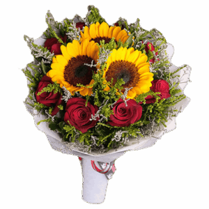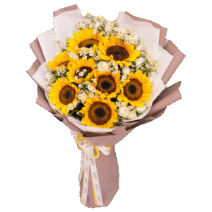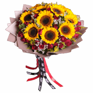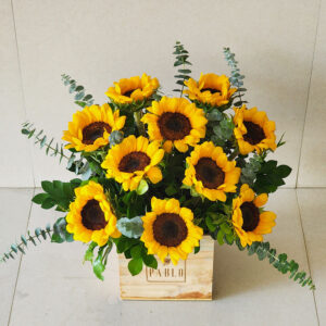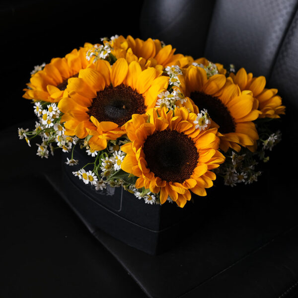 Sunflowers arranged in our heart-shaped box — bright, bold, and made to stand out.