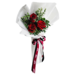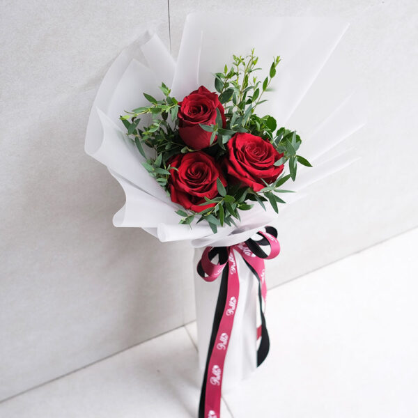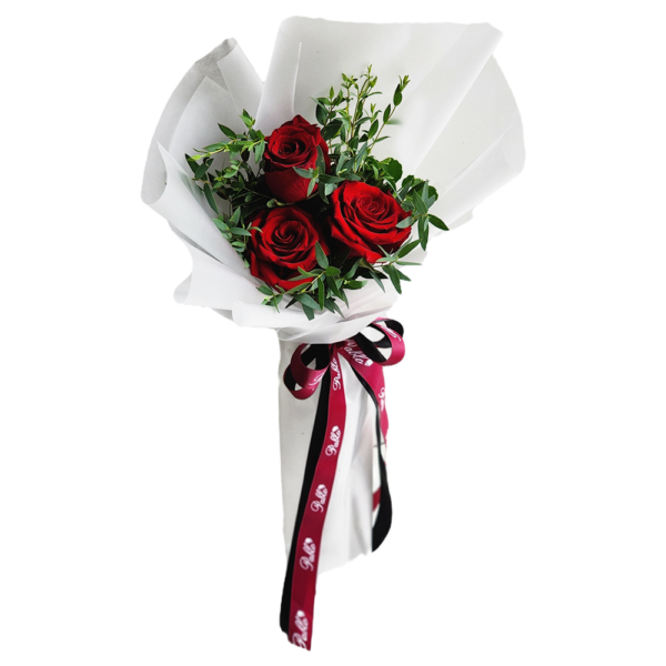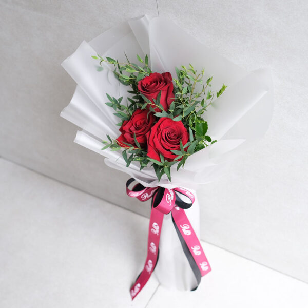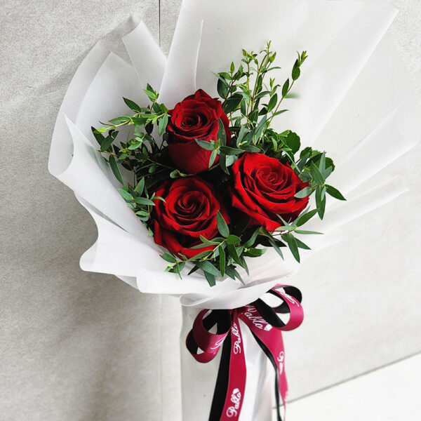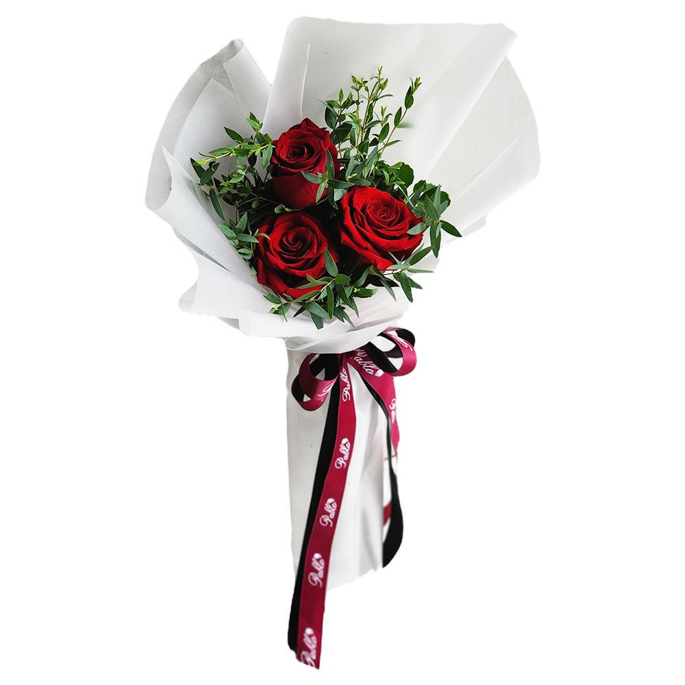 Keep it simple yet thoughtful with 3 Ecuadorian roses and parvy greens. A subtle way to show you care, without overdoing it.
