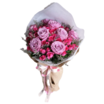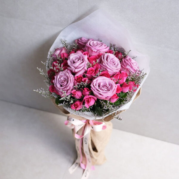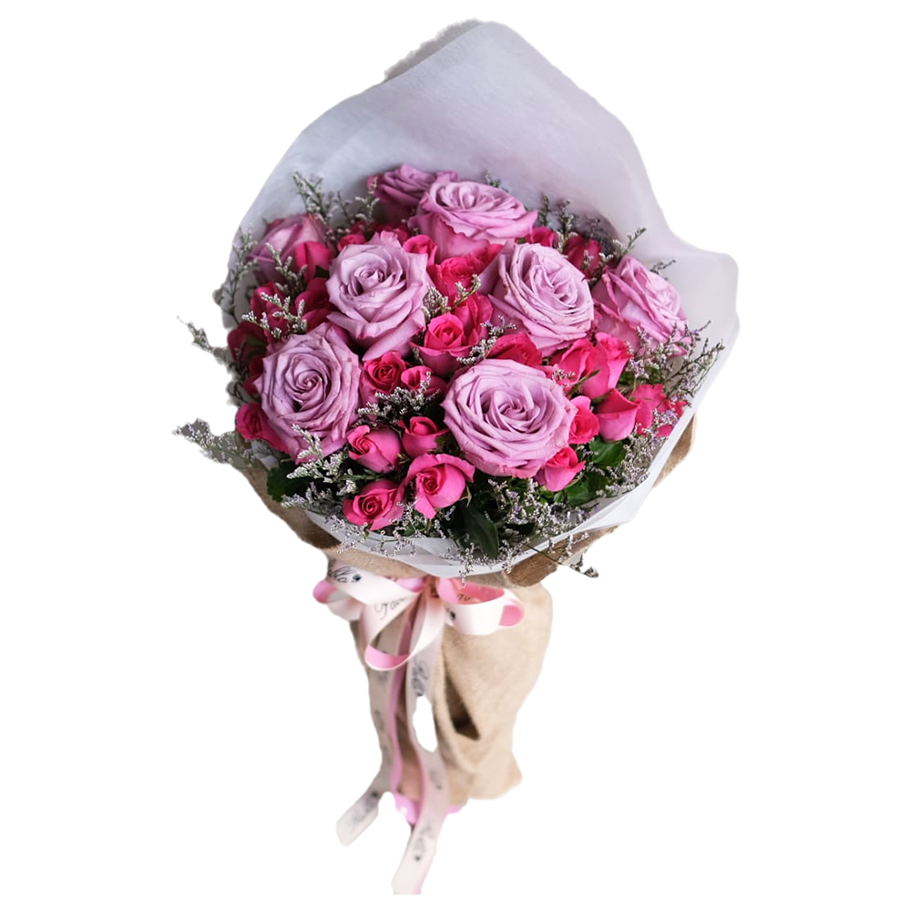 A romantic round bouquet featuring 8 purple Ecuadorian roses surrounded by 36 long-stem local roses. A bold way to say, “I’m all in.”