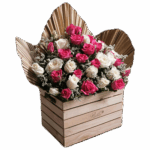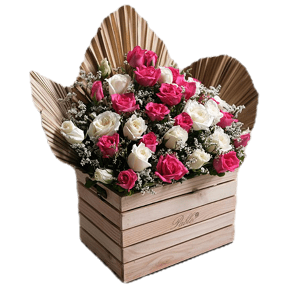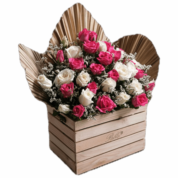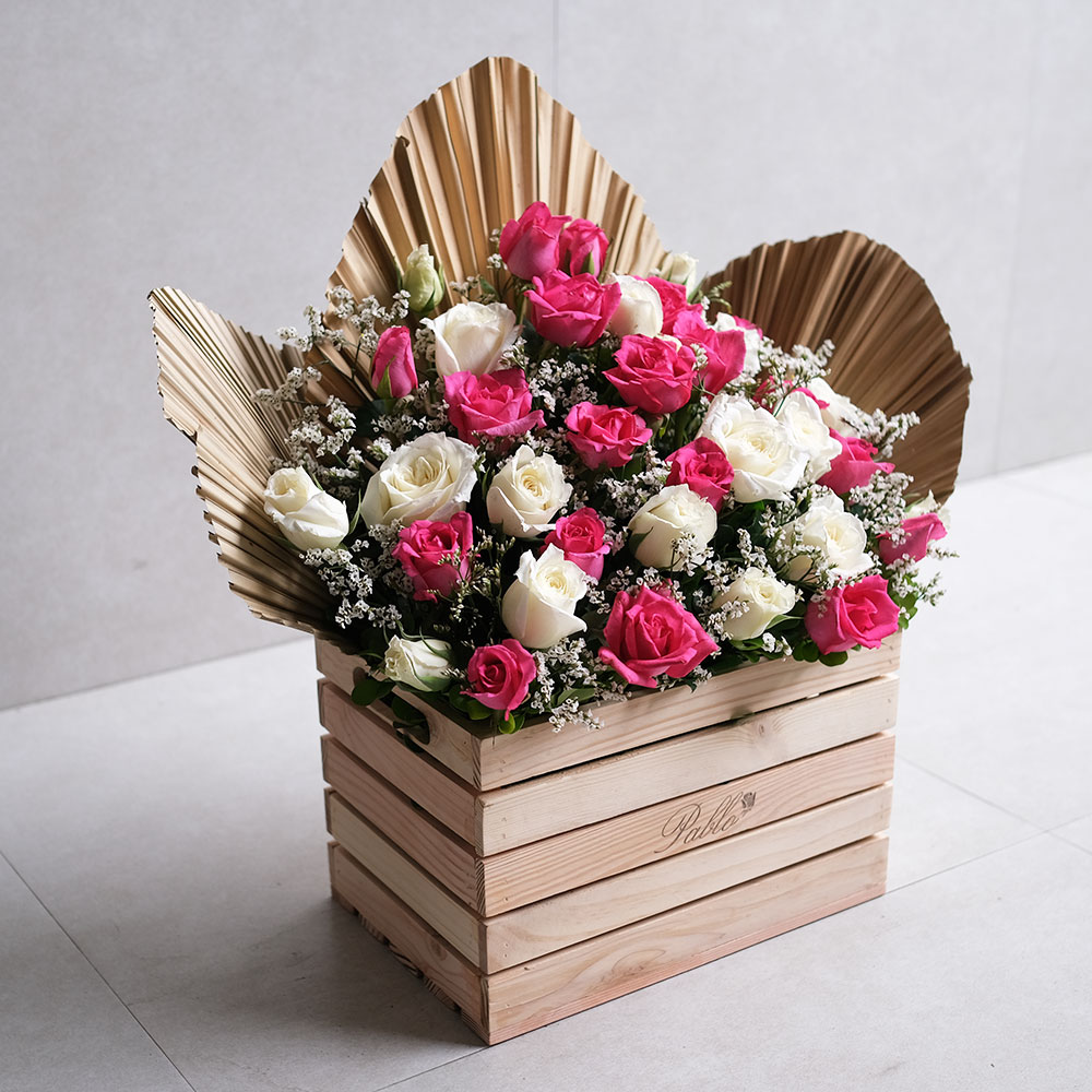 A rustic crate filled with 36 fresh local roses — bold, beautiful, and arranged with Pablo’s classic edge.