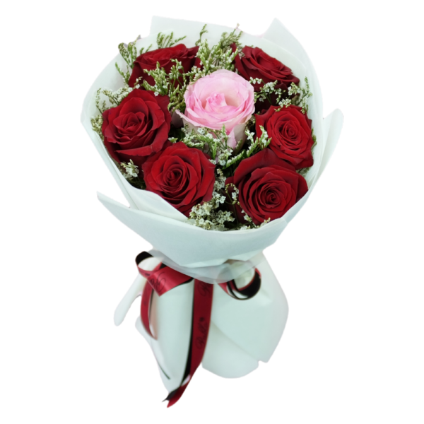 Standout piece with 6 Ecuadorian roses encircling one unique bloom in the center. Thoughtfully arranged for someone truly special.