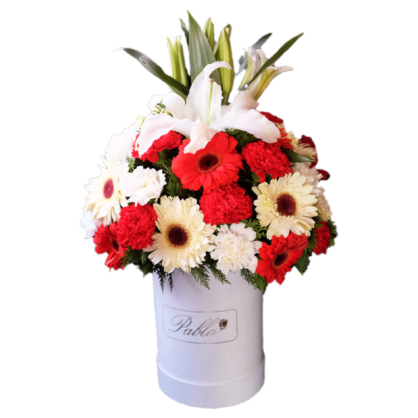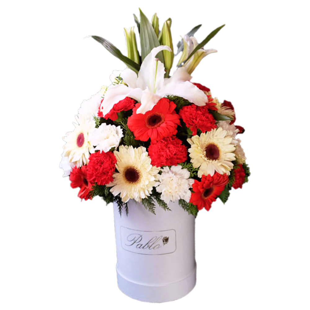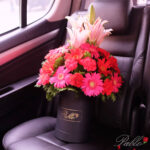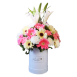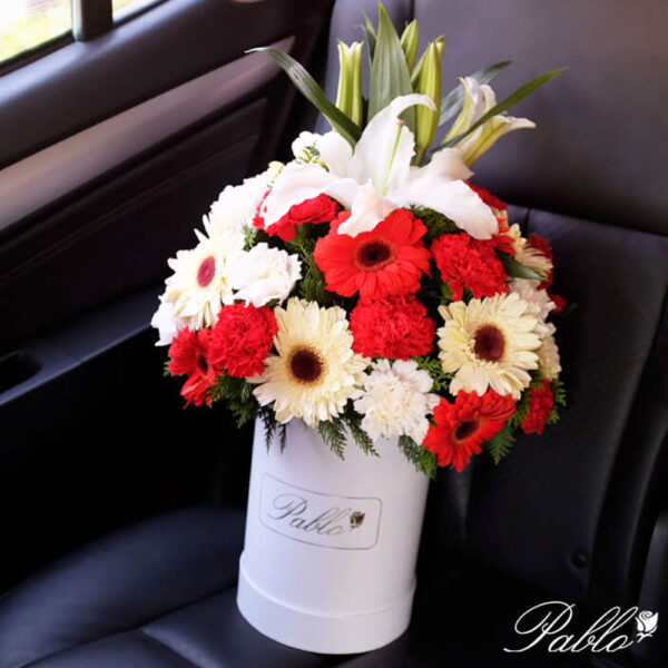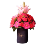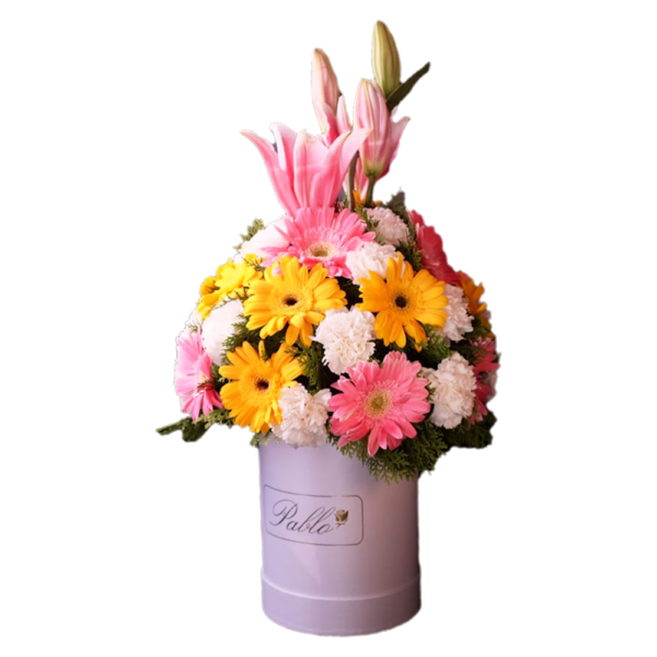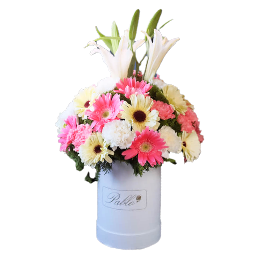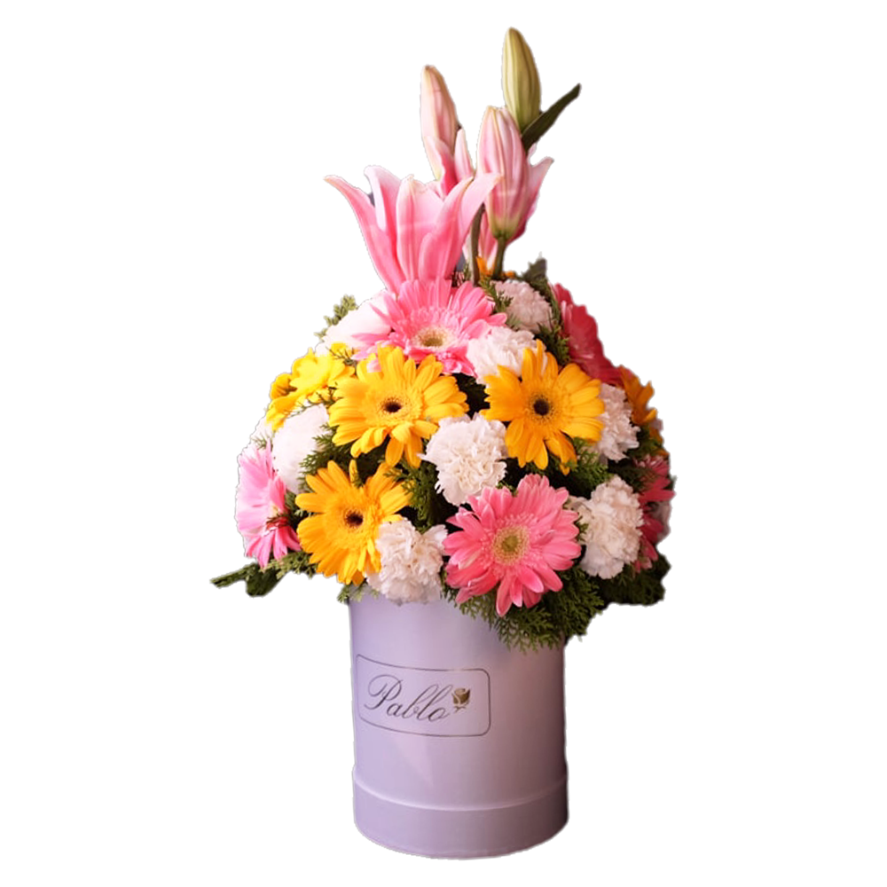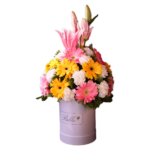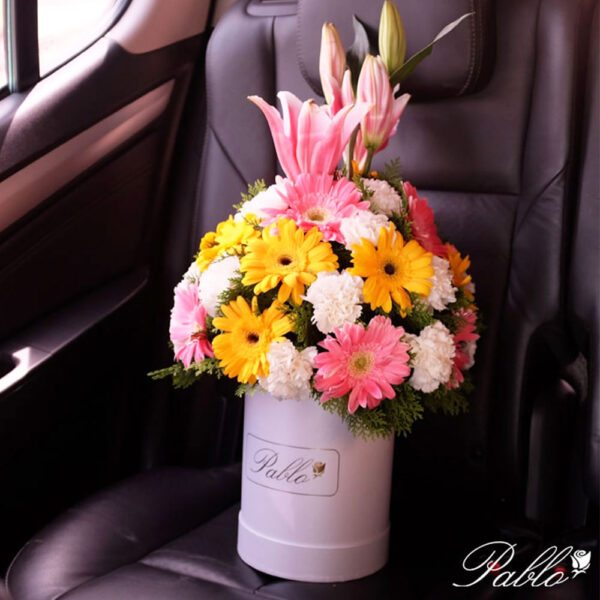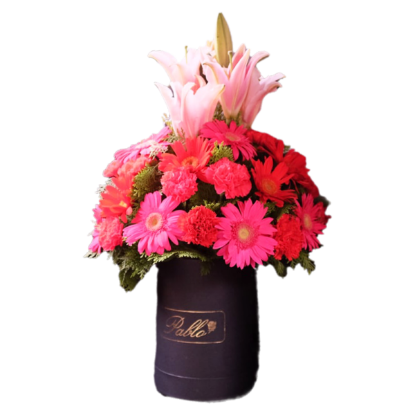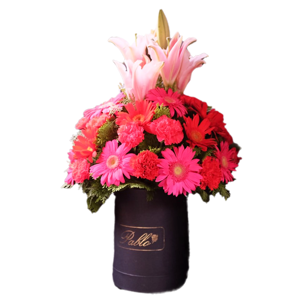 A round and romantic mix of stargazers, different color carnations, and gerberas, styled in our signature bucket. Bold, bright, and full of love.