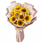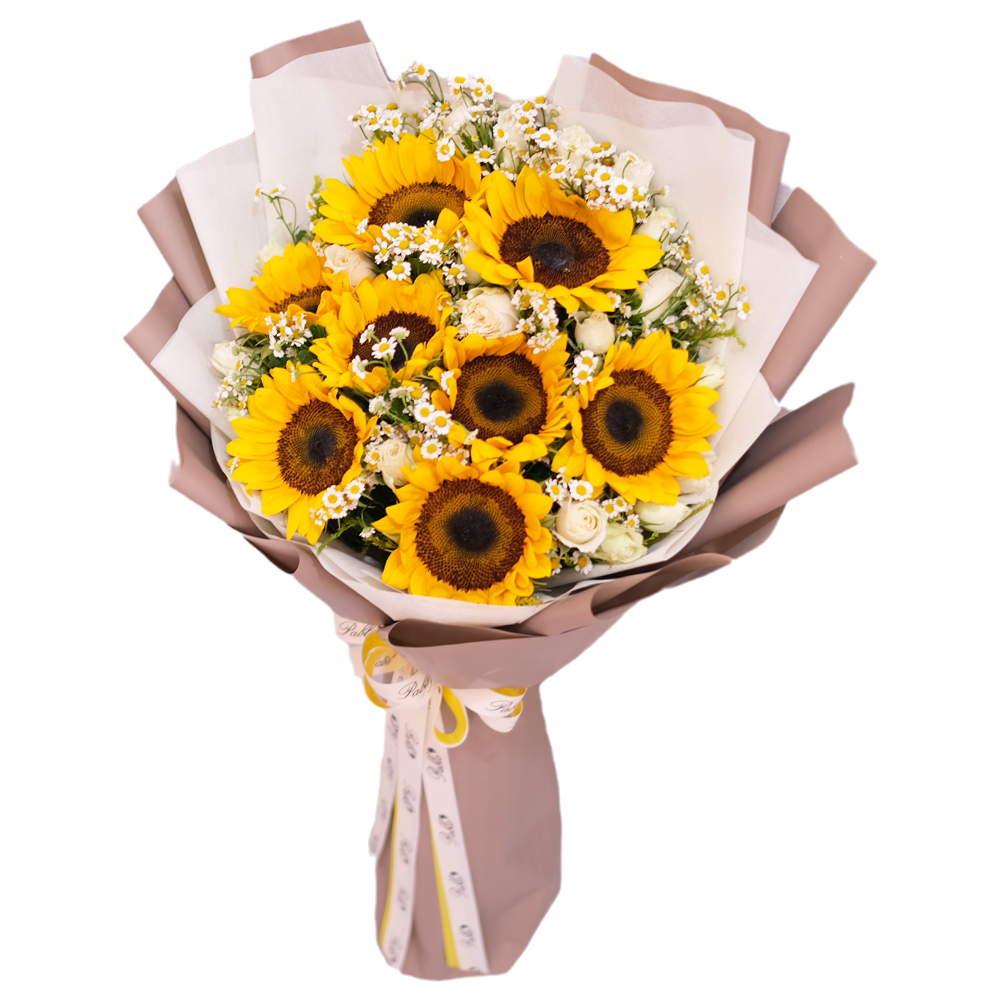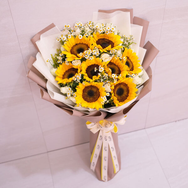 A half-face bouquet of 8 sunflowers with daisy fillers — fresh, sunny, and full of energy