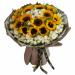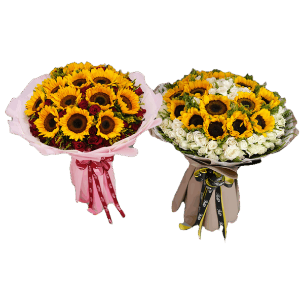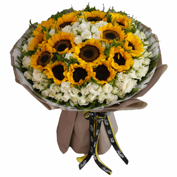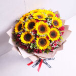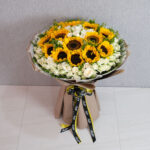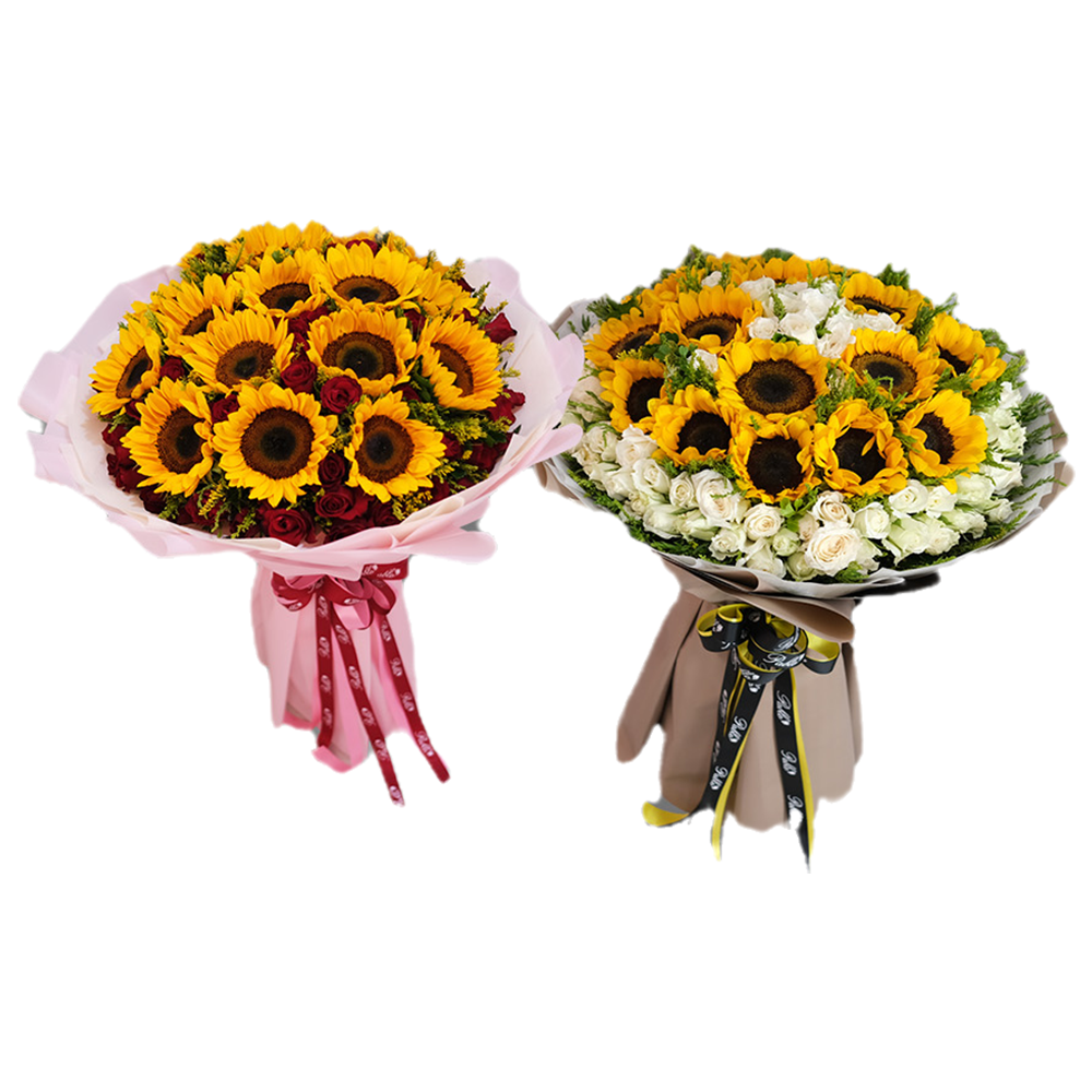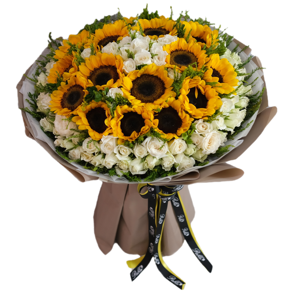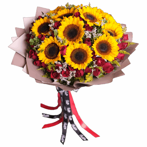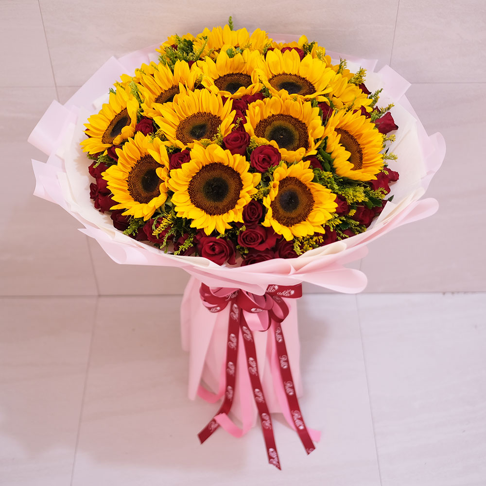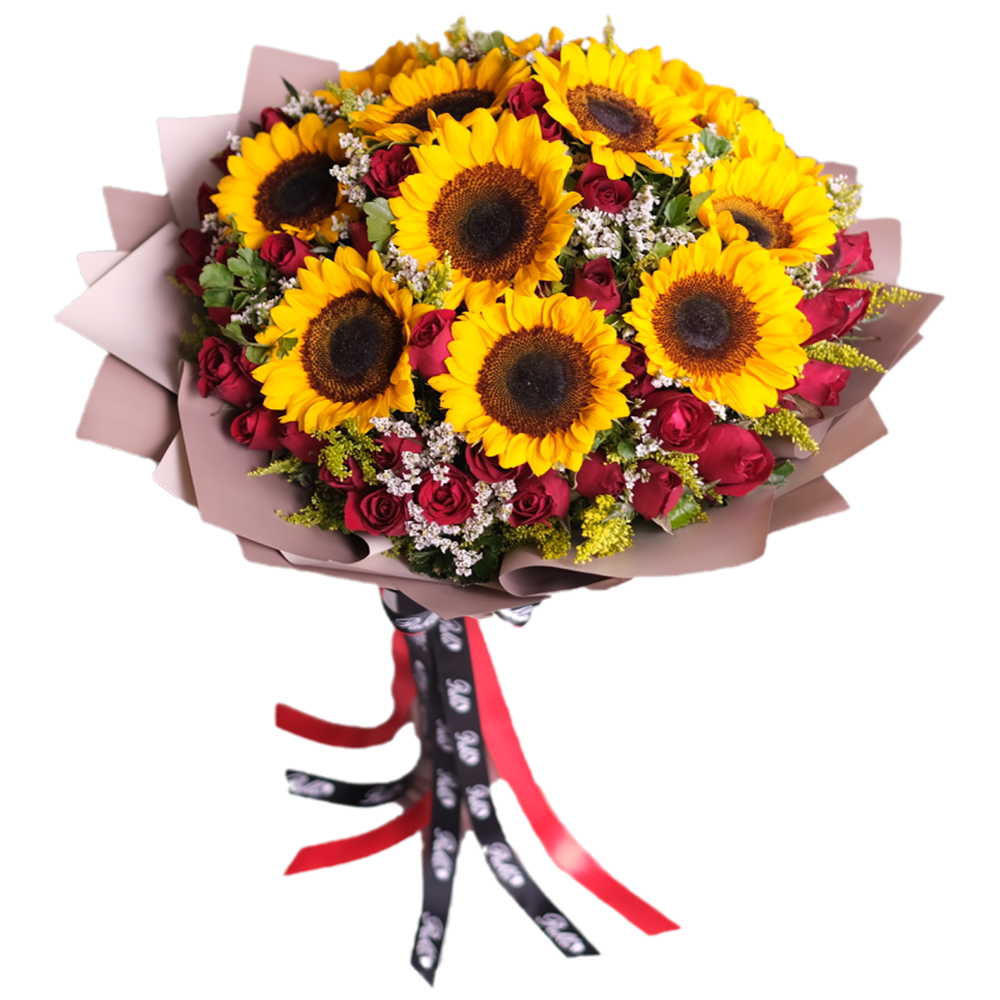 Grand display of 16 sunflowers and 54 local roses — bright, powerful, and made to impress with a lasting impression.