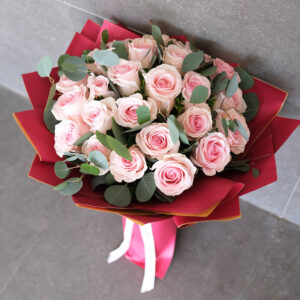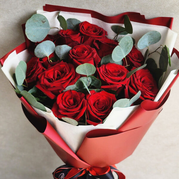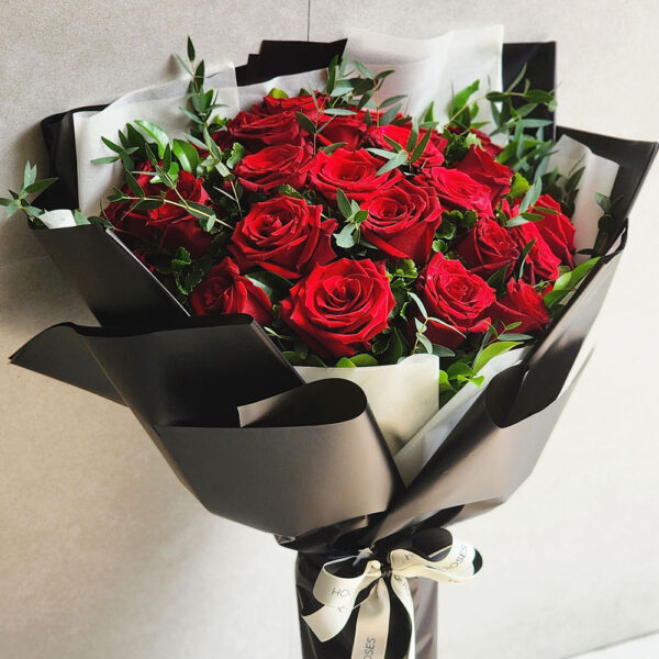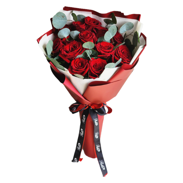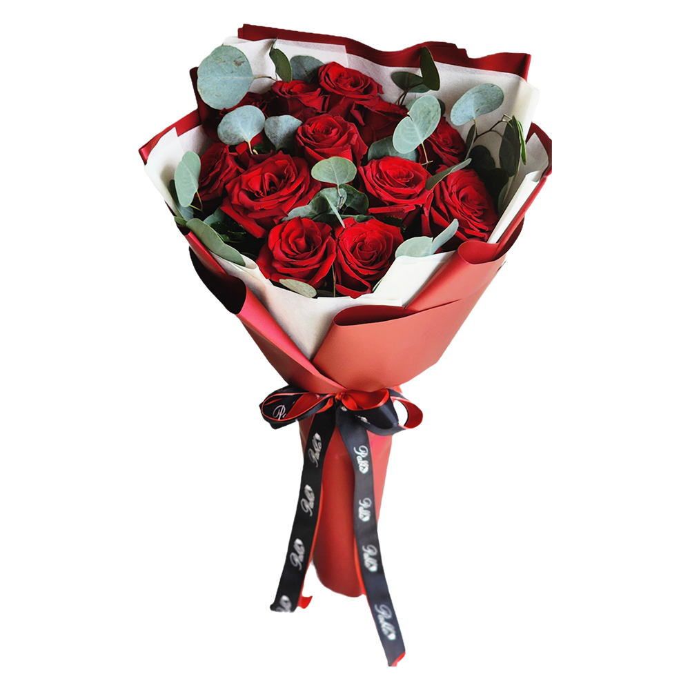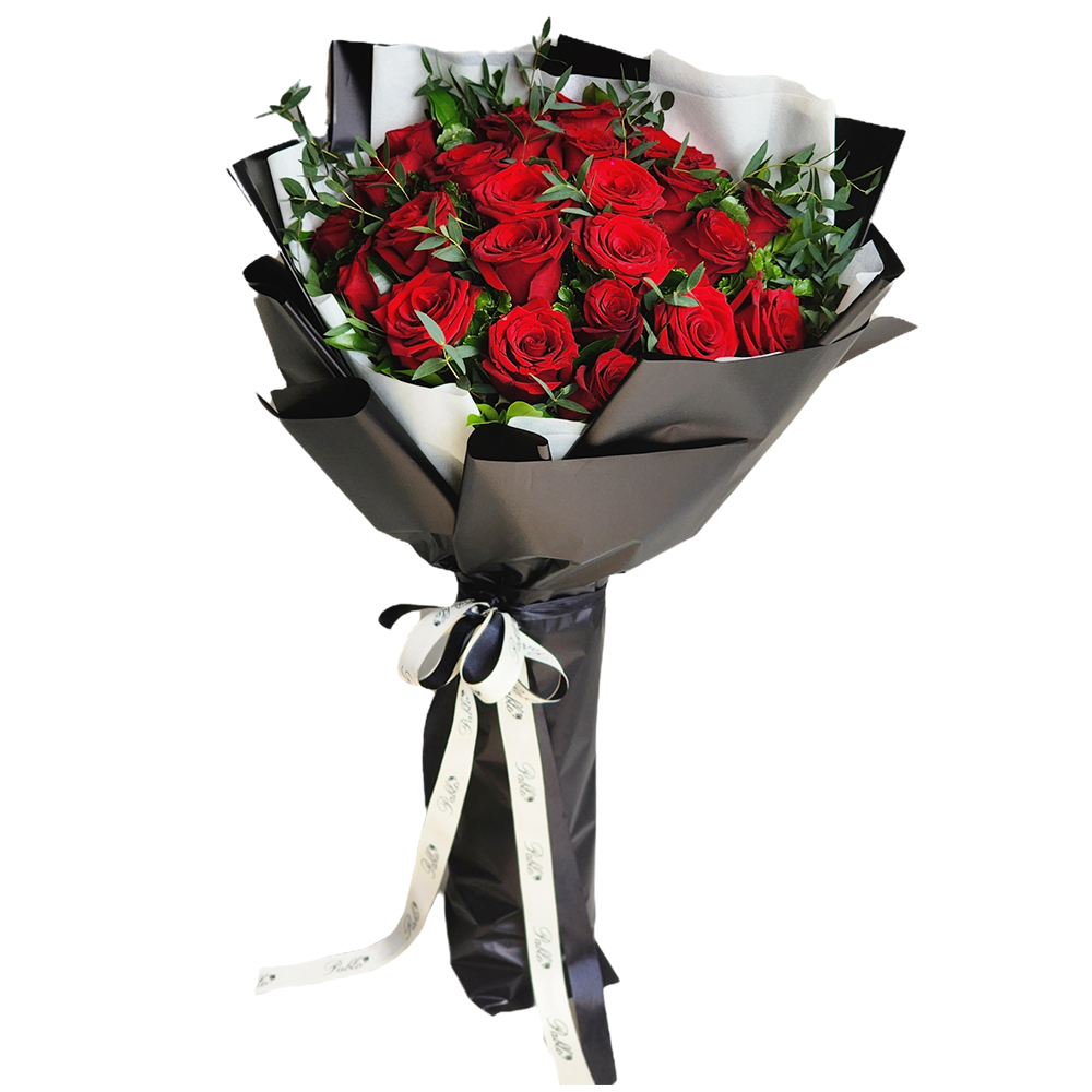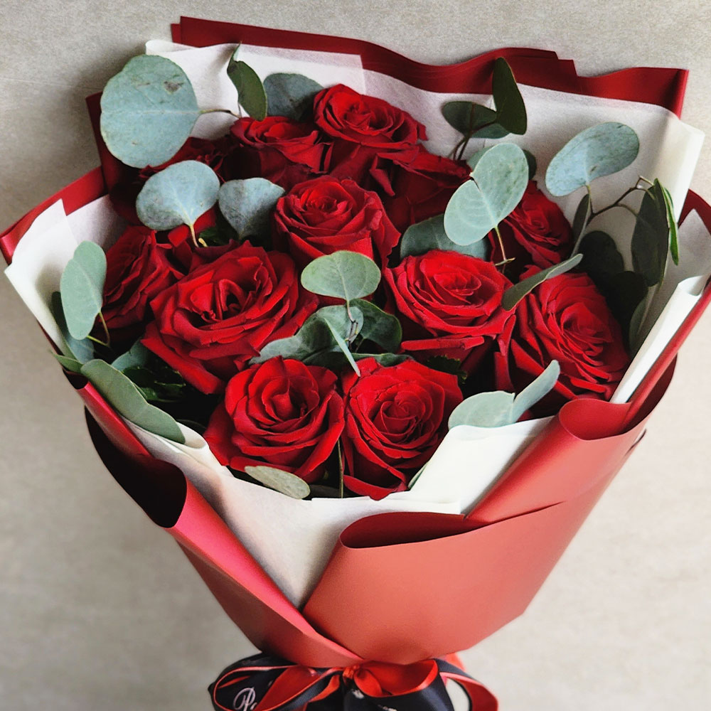Experience quiet luxury with 12 premium Ecuadorian roses, paired with silver dollar eucalyptus for that crisp, fresh-from-the-vault elegance. Finished in true Pablo style.